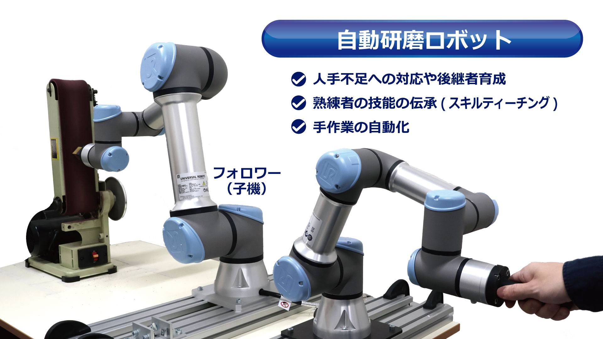 | 自動搬送装置 | 人協働ロボット作業を効率化する機構提案 ロボットを組み込む装置全体の開発やアーム先端部に取り付けるハンドの機構提案、作業プログラムのティーチング等を行います。開発コストを抑えつう高効率の作業を実現する機構の提案により、製造現場の人で不足解消に貢献します。 |